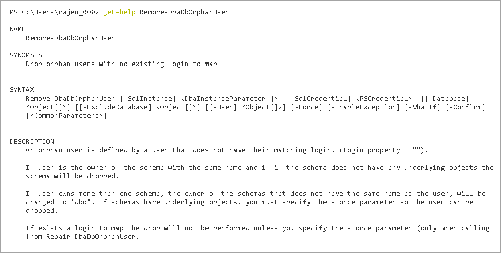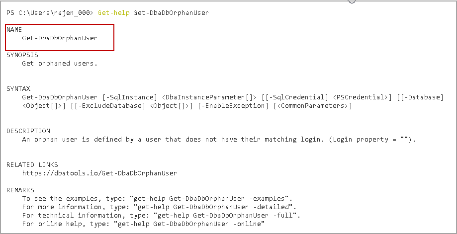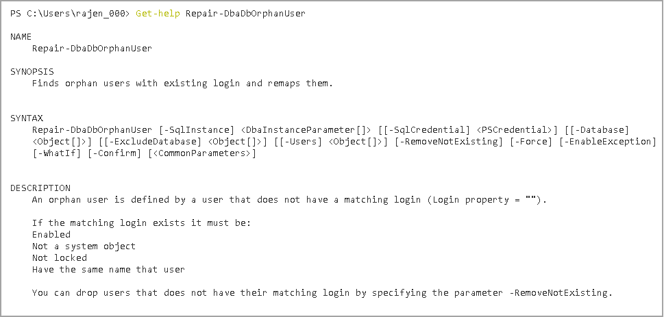 Once we restore SQL database in another instance, we can get a list of orphan users with Get-DbaDbOrphanUser command. We should always check the syntax description of a particular command before using it.