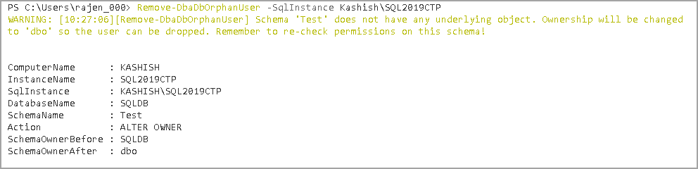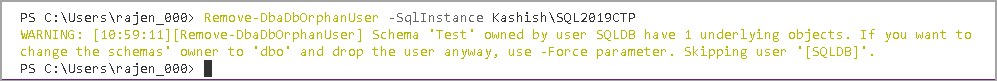 Once we have restored the database, try to drop Orphan user again with Remove-DbaDbOrphanuser command. We cannot drop this orphan user because it owns an object in the database.