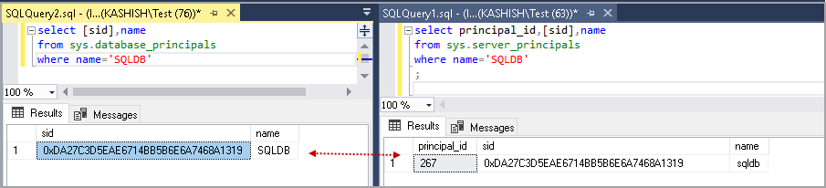 select principal_id,[sid],name from sys.server_principals where name='SQLDB' Go select [sid],name from sys.database_principals where name='SQLDB' |