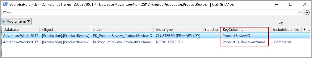 > Get-DbaHelpIndex -SqlInstance Kashish\SQL2019CTP -Database AdventureWorks2017 -Object Production.ProductReview | Out-GridView |
