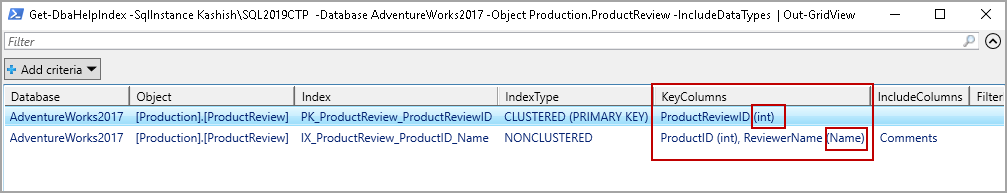 > Get-DbaHelpIndex -SqlInstance Kashish\SQL2019CTP -Database AdventureWorks2017 -Object Production.ProductReview -IncludeDataTypes | Out-GridView |