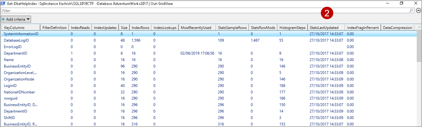 > Get-DbaHelpIndex -SqlInstance Kashish\SQL2019CTP -Database AdventureWorks2017 | Out-GridView |