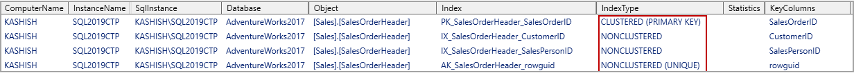 The following command checks all indexes in AdventureWorks2017 database for Kashish\SQL2019CTP SQL instance.