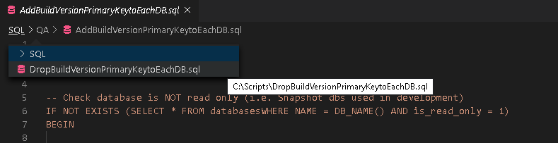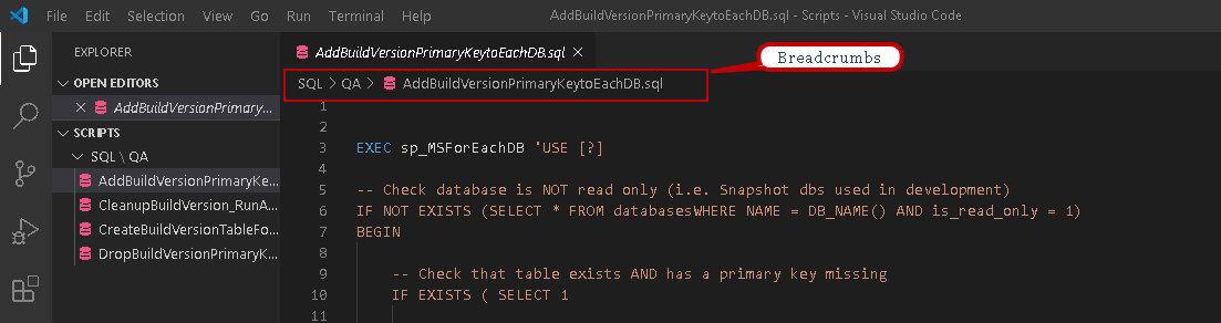 Once you open any file in VS Code, it shows its current location on the top, and you can navigate quickly between files and folders. For example, for my script, it gives me the path SQL -> QA -> script name.