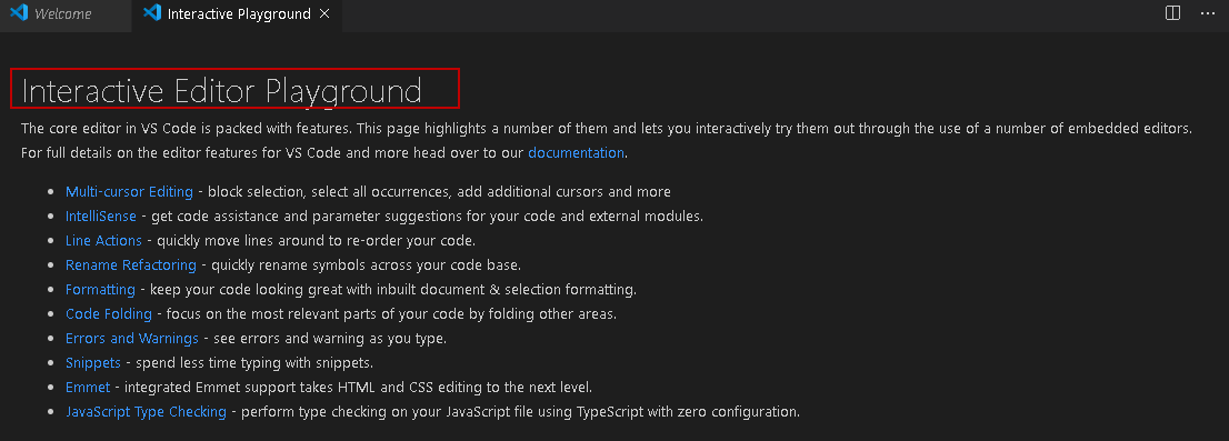 Visual Studio Code provides an interactive playground to try out its features. You can launch an interactive playground from the link on the Welcome page.