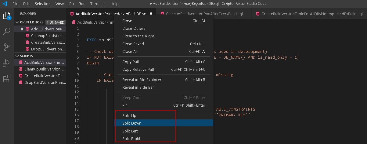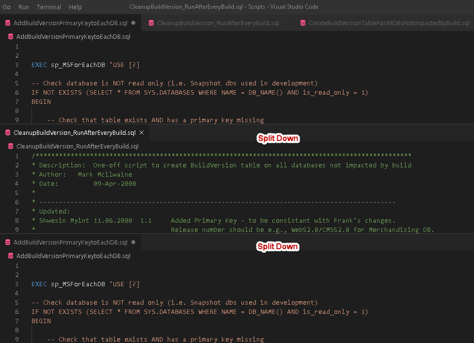 For example, once you split down the files, it creates a new region for the split files. In the below screenshot, you get two files splits in the current window. It is useful when you want to compare two or more scripts together or want to reference another script.