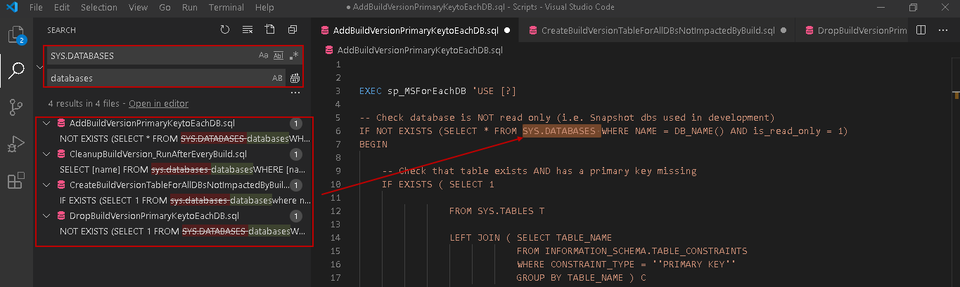 It is to search for a specific keyword in all the open files in the editor window. For example, suppose we want to replace the sys.databases with databases keyword in all open files. Enter the keyword and search it in all open editor files. You see each occurrence of the keyword in all editor files. It also shows line after keyword replacement, as highlighted below.