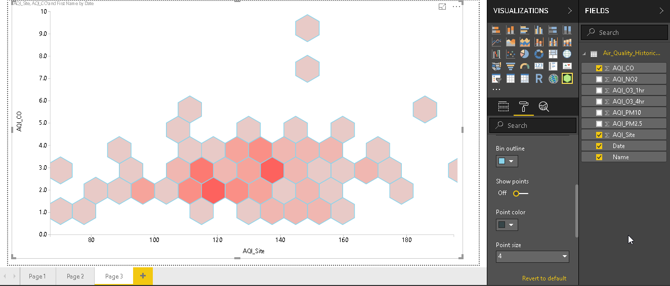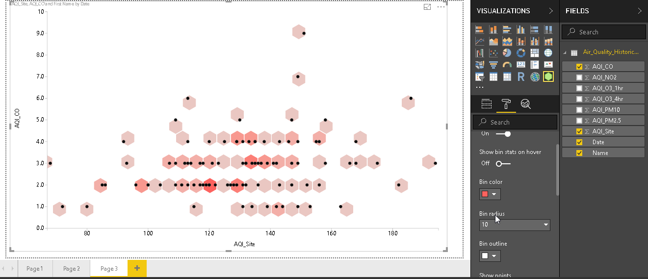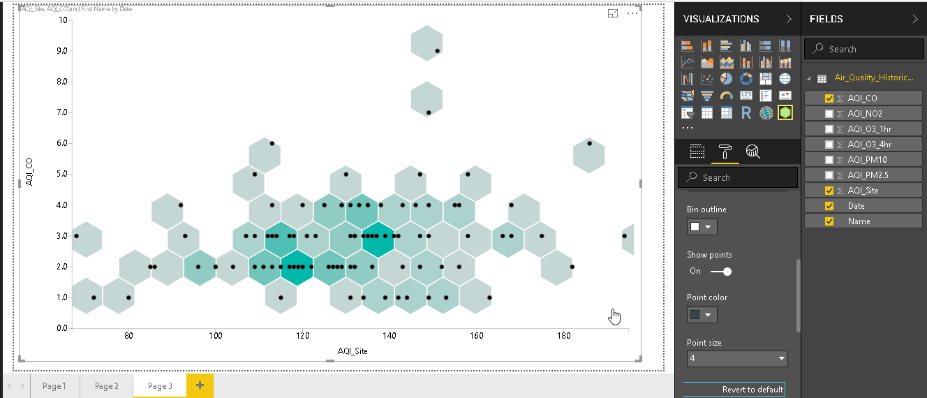 - Show bins: By default, show bins are ‘On’. Move this slider and turn it off. In below image, we can see just the data points without the hexagonal bins.