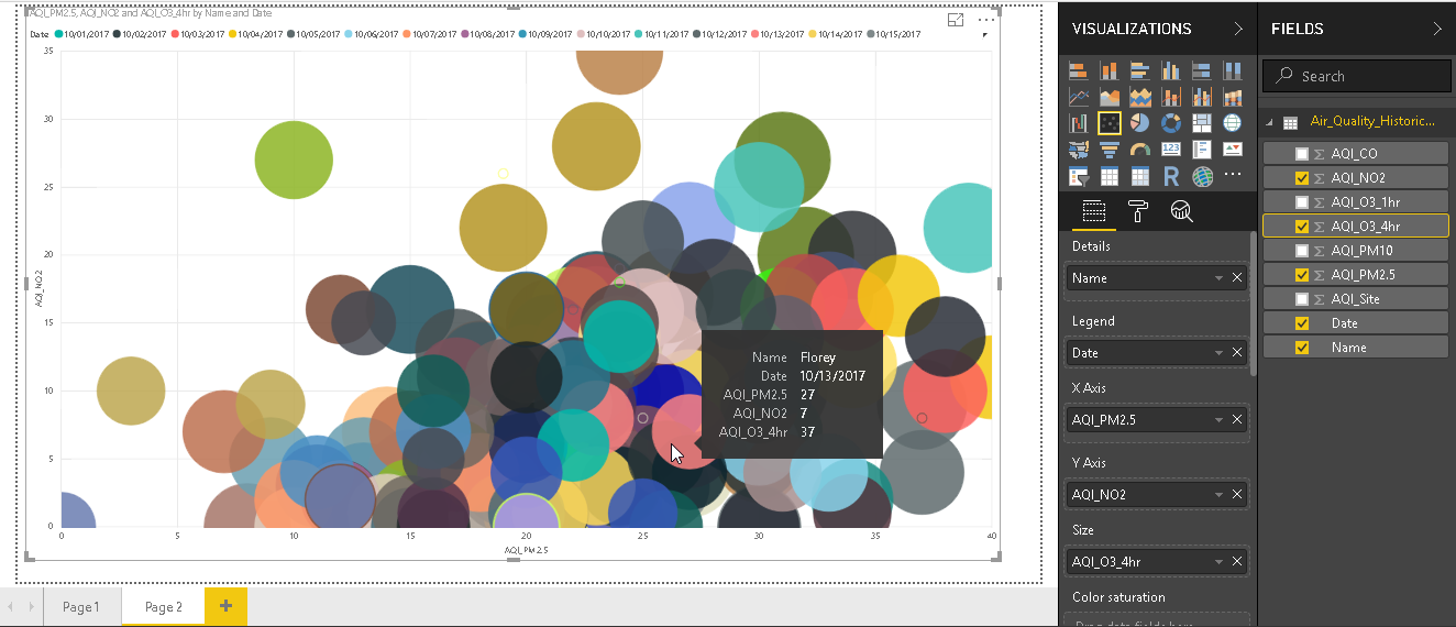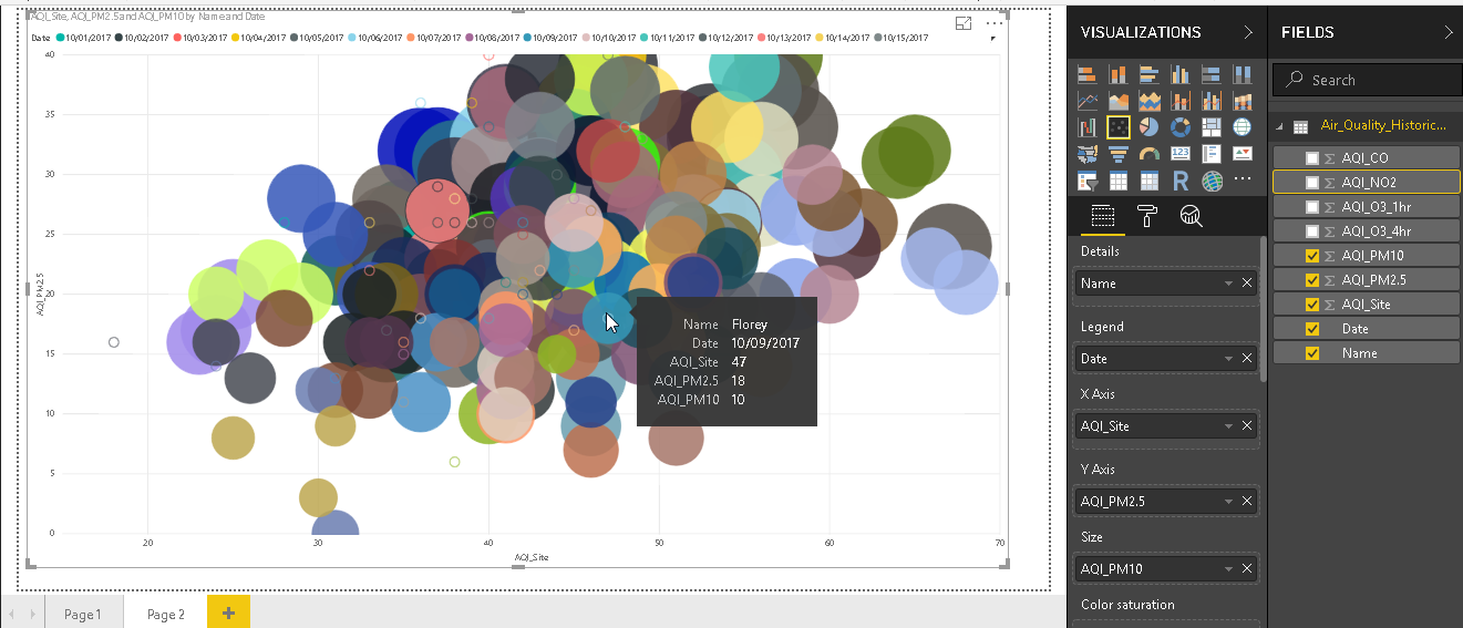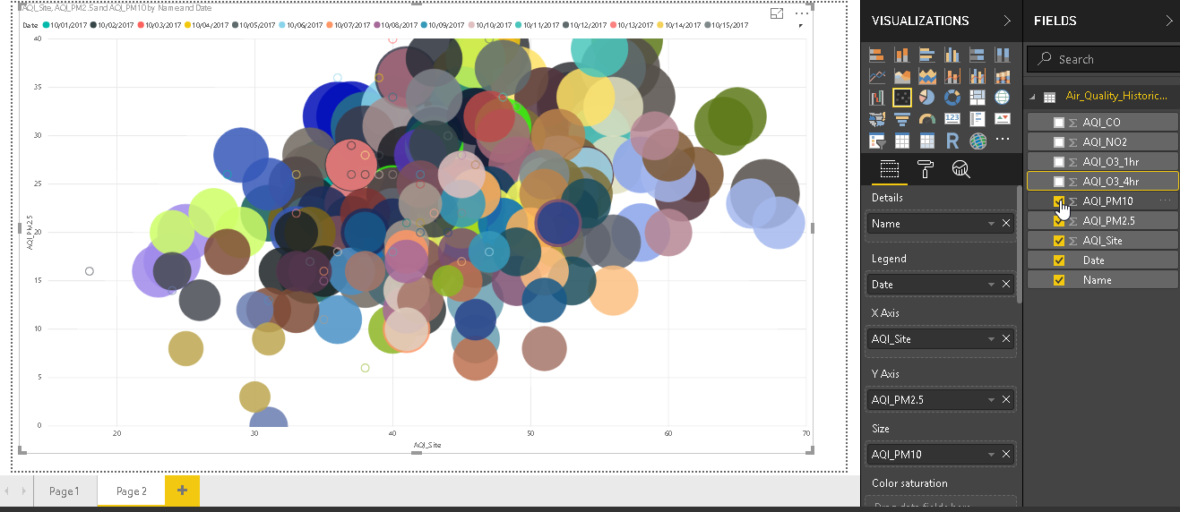 In the above image, bubbles sizes are similar for all bubbles. It does not vary the size of the bubble in according to our data. In the field area, define Size as per our dataset column. For example, in the below chart, we have set Size as AQI_PM10. It changes the scatter chart now with various bubble sizes. These bubbles are overlapping with each other, so it is difficult to get analysis based on the bubble size.