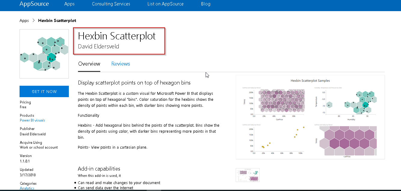Go to the link ‘Hexbin Scatterplot’ and get details of it from Power BI visuals.