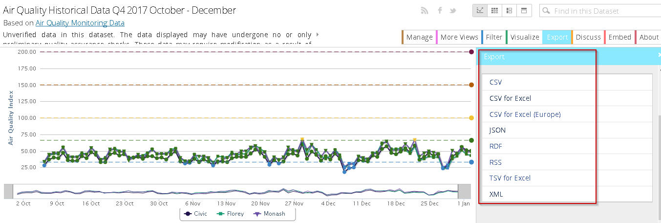 - Export and Show data: In the top right corner of the chart, we have the option to export the data and show data. We can export from the dataset using the ‘Export Data’ option.