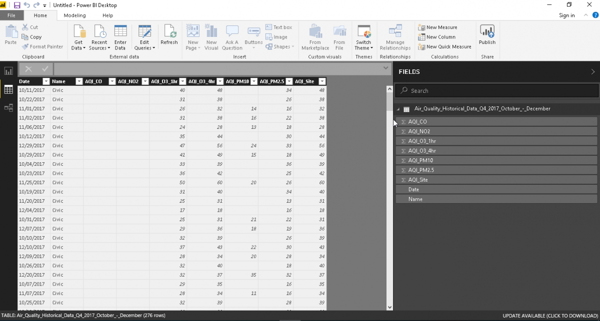 We have imported data from a flat file (.CSV) in the previous article, therefore in this article, we will not cover importing in detail. In this article, we will use sample data Air Quality Historical Data Q4 2017 October – December. This data contains air quality historical data of various components for the period of October to December 2017.