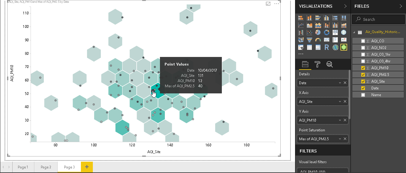Using the point saturation, we can set the aggregation as well like average, min, max etc. for example, in below chart, we set the Point Saturation as ‘Max of AQI_PM2.5’. In the tooltip, also you can see the all columns value and point saturation value as ‘Max of AQI_PM2.5’