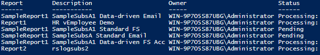 $webSRV = New-WebServiceProxy -Uri "http://win-9p7o5s87ubg/ReportServer/ReportService2010.asmx" -Namespace SSRS.ReportingService2010 -UseDefaultCredential; $mySubsList = $webSRV.ListSubscriptions("/"); $mySubsList | select report, description, owner, status, lastexecuted, subscriptionid | format-table -auto |