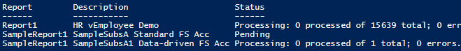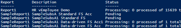 filter FileShareAcountFilter { ForEach($Param in $_.DeliverySettings.ParameterValues) { if($Param.Name -eq "DEFAULTCREDENTIALS" -and $Param.Value -eq "True") { $_ break } } } $webSRV = New-WebServiceProxy -Uri "http://win-9p7o5s87ubg/ReportServer/ReportService2010.asmx" -Namespace SSRS.ReportingService2010 -UseDefaultCredential; $mySubsList = $webSRV.ListSubscriptions("/") | where {$_.DeliverySettings.Extension -eq "Report Server FileShare"} ; $mySubsList | select report, description, status, lastexecuted, subscriptionid | format-table –auto |
