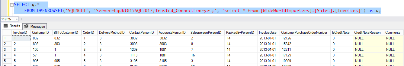 12SELECT q.*FROM OPENROWSET('SQLNCLI', 'Server=hqdbt01\SQL2017;Trusted_Connection=yes;', 'select * from [WideWorldImporters].[Sales].[Invoices]') as q;