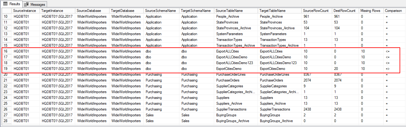 1234567891011121314151617181920212223selects.Instance SourceInstance,t.Instance TargetInstance,s.DB SourceDatabase,t.DB TargetDatabase,s.SchemaName SourceSchemaName,t.SchemaName TargetSchemaName,s.TableName SourceTableName,t.TableName TargetTableName,s.rows as SourceRowCount,t.rows as DestRowCount,case when s.rows>t.rows then s.Rows-t.Rows else t.Rows-s.Rows end 'Missing Rows',case when s.rows>t.rows then '<='when s.Rows=t.Rows then '='else '=>' end 'Comparison'from@SourceDatabase s, @TargetDatabase twheres.SchemaName=t.SchemaName ands.TableName = t.TableName-- and--s.rows!=t.rowsYou can see the difference in number of rows in the following output