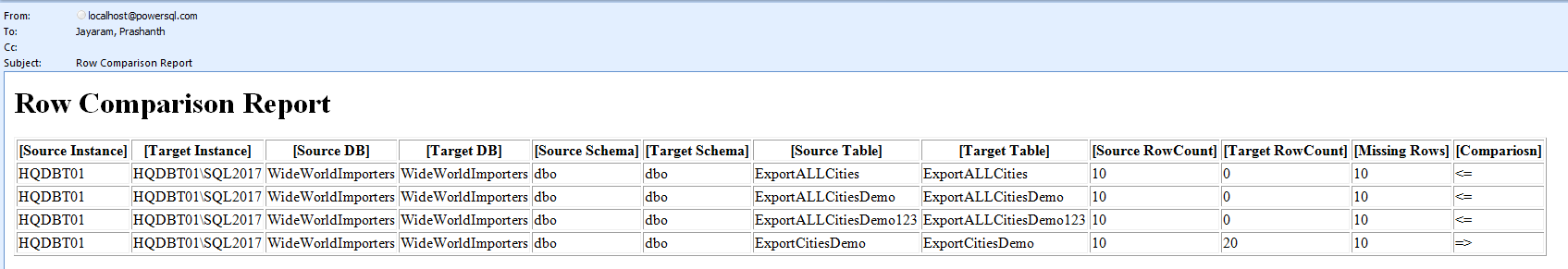 1234567891011121314151617181920212223242526272829303132333435363738394041424344454647484950515253545556575859606162IF((Select count(*) from@SourceDatabase s, @TargetDatabase twheres.SchemaName=t.SchemaName ands.TableName = t.TableNameands.rows!=t.rows)>0)beginDECLARE @tableHTML NVARCHAR(MAX) ;SET @tableHTML =N'<H1>Row Comparison Report</H1>' +N'<table border="1">' +N'<tr><th>[Source Instance]</th><th>[Target Instance]</th><th>[Source DB] </th><th>[Target DB]</th><th>[Source Schema]</th><th>[Target Schema]</th><th>[Source Table]</th><th>[Target Table]</th><th>[Source RowCount]</th><th>[Target RowCount]</th><th> [Missing Rows]</th><th> [Compariosn]</th></tr>' +CAST ( (selecttd=s.Instance ,' ',td=t.Instance ,' ',td=s.DB,' ',td=t.DB, ' ',td=s.SchemaName,' ',td=t.SchemaName,' ',td=s.TableName,' ',td=t.TableName, ' ',td=cast(s.rows as varchar(10)),' ',td=cast(t.rows as varchar(10)), ' ',td=case when s.rows>t.rows then cast((s.Rows-t.Rows) as varchar(10))else cast((t.Rows-s.Rows) as varchar(10)) end ,' ',td=case when s.rows>t.rows then '<='when s.Rows=t.Rows then '='else '=>' end, ' 'from@SourceDatabase s, @TargetDatabase twheres.SchemaName=t.SchemaName ands.TableName = t.TableNameands.rows!=t.rowsFOR XML PATH('tr'), TYPE) AS NVARCHAR(MAX) ) +N'</table>' ;EXEC msdb.dbo.sp_send_dbmail @recipients='pjayaram@SQL.com',@subject = 'Row Comparison Report',@profile_name='PowerSQL',@body = @tableHTML,@body_format = 'HTML' ;END