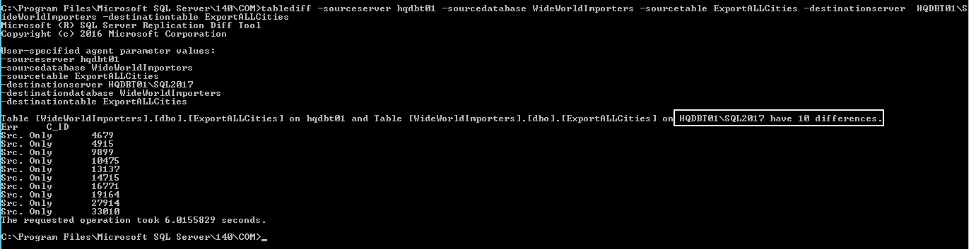 C:\Program Files\Microsoft SQL Server\140\COM>tablediff -sourceserver hqdbt01 -sourcedatabase WideWorldImporters -sourcetable ExportALLCities -destinationserver HQDBT01\SQL2017 -destinationdatabase WideWorldImporters -destinationtable ExportALLCities