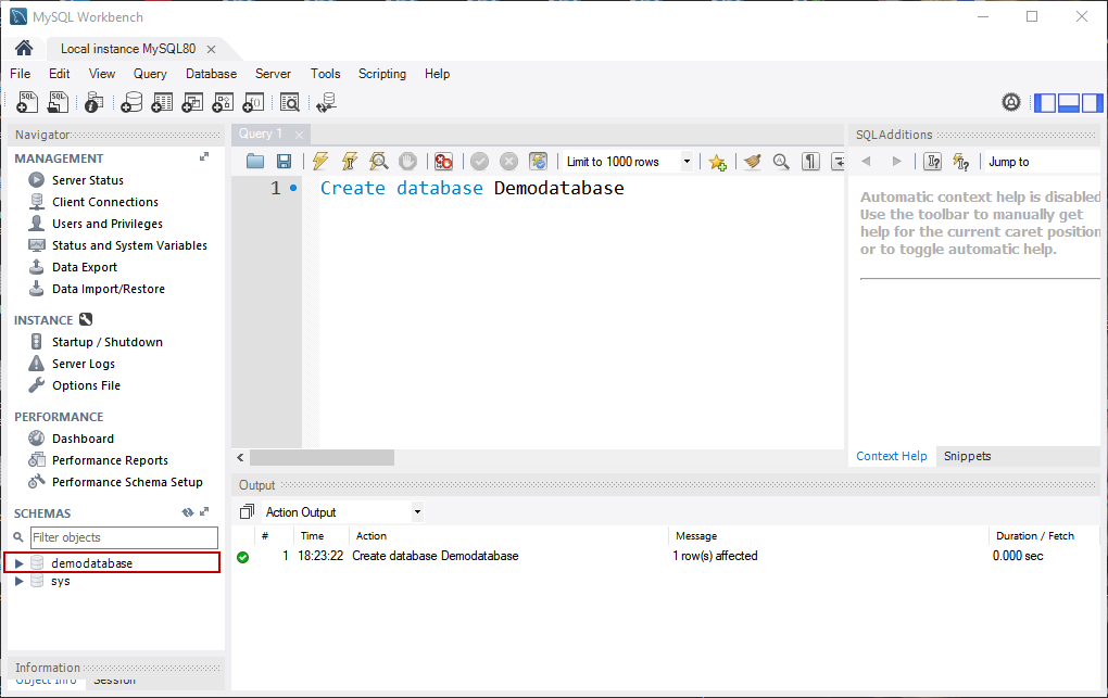 Once the query executes successfully, you can see the new database in the “SCHEMAS” pan. See the following image:
