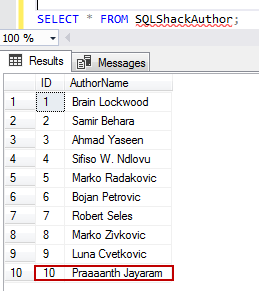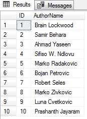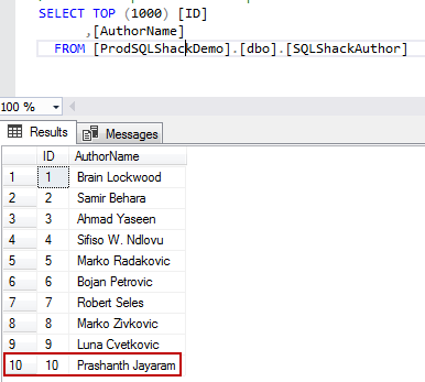 SELECT TOP (1000) [ID] ,[AuthorName] FROM [ProdSQLShackDemo].[dbo].[SQLShackAuthor] |