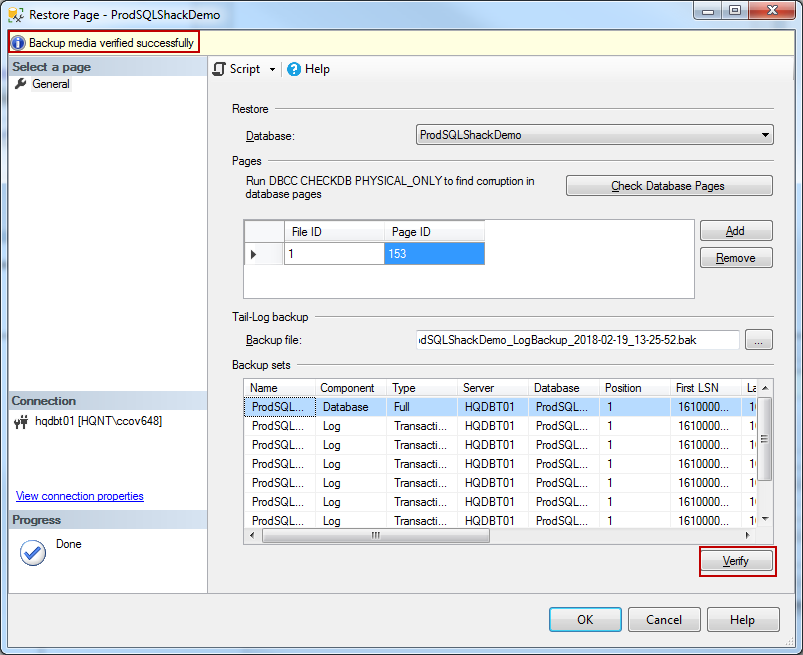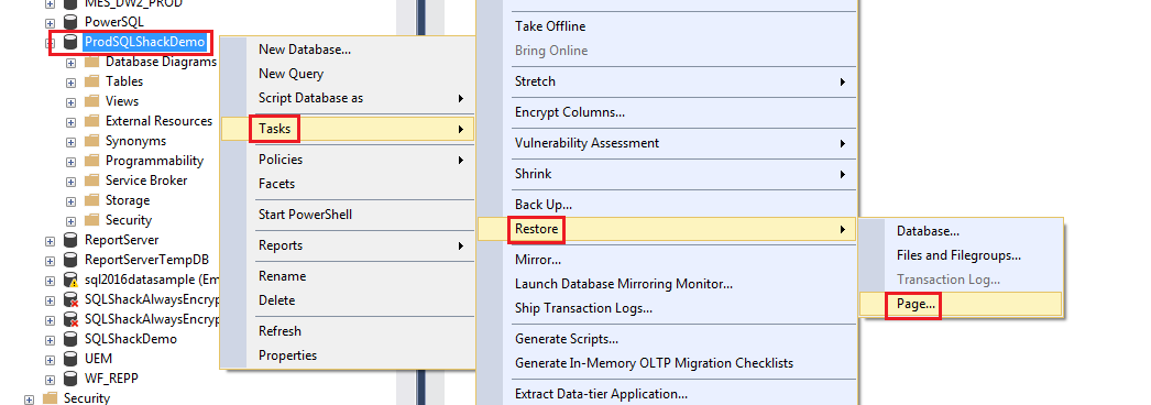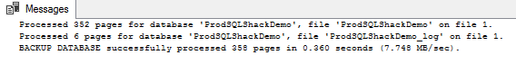 This entire illustration is based on the ProdSQLShackDemo database. Let’s walk through the following SQL to get a better understanding of the page-level restoration concepts. Here are the steps involved: