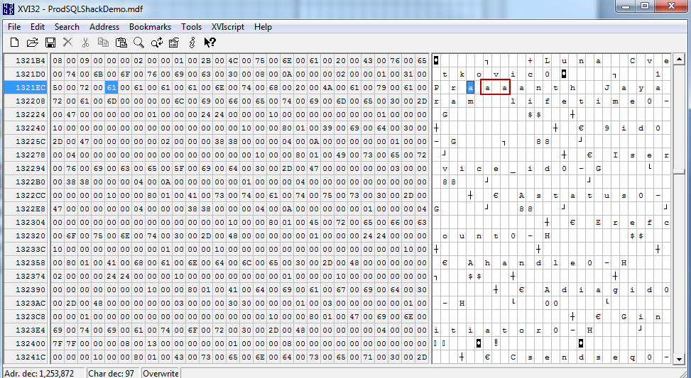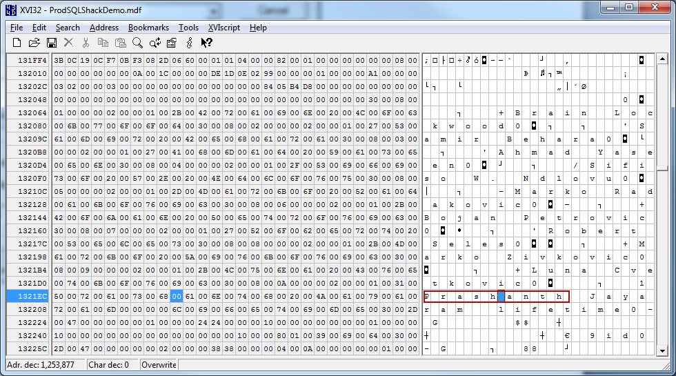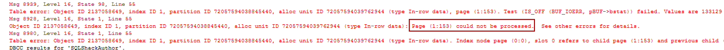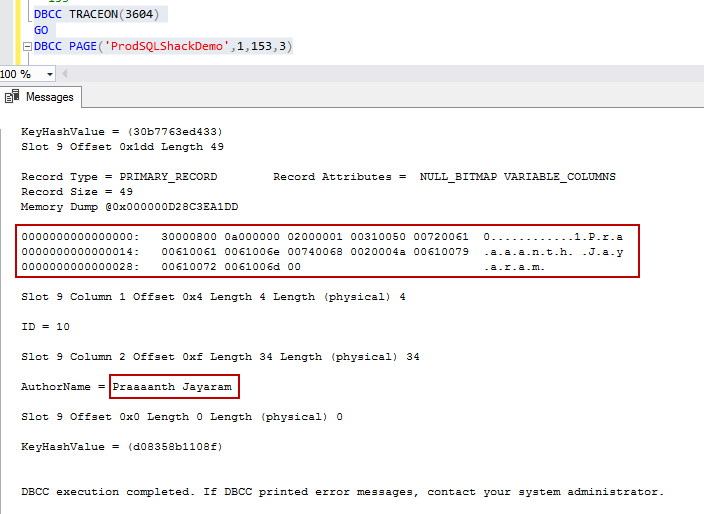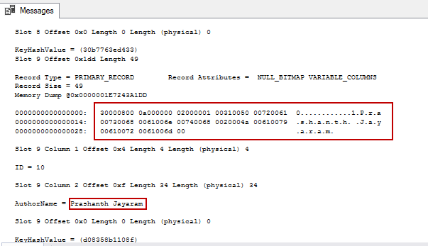 We can see that this only returns two pages. For the demo, I will be focusing on the page ID 153. I’m going to deliberately corrupt page 153 with two bits of information. The table SQLShackAuthor contains a value, Prashanth Jayaram, which we will meddle with, to corrupt the page in this demo.