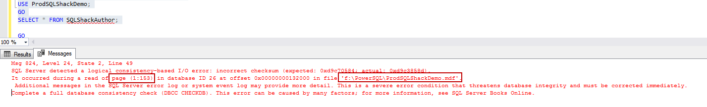 It occurred during a read of page (1:153) in database ID 26 at offset 0x00000000132000 in file ‘f:\PowerSQL\ProdSQLShackDemo.mdf’.