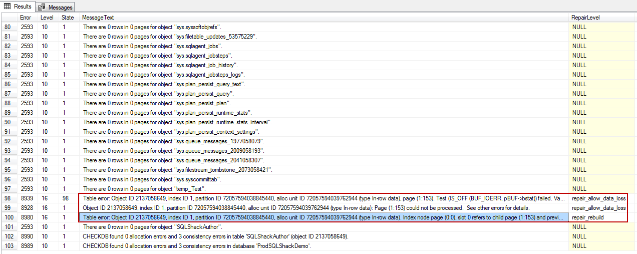 DBCC CHECKDB('ProdSQLShackDemo') with tableresults |
