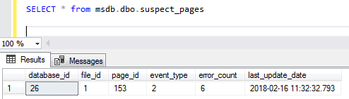 We can also query the msdb.dbo.suspect_pages table to get the details on the corrupted pages.