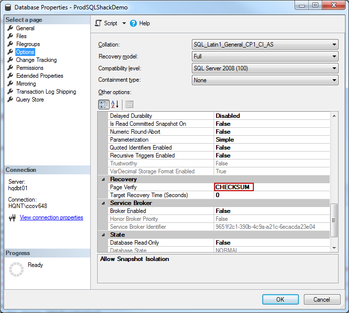 ALTER DATABASE ProdSQLShackDemo SET PAGE_VERIFY CHECKSUM |
