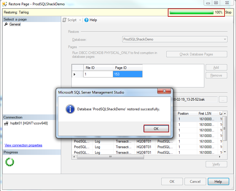 The database will go through the process of restoring the clean pages and a message on whether the process was successful or not would be displayed. we can see that the database restored successfully. Go ahead and press the OK button.