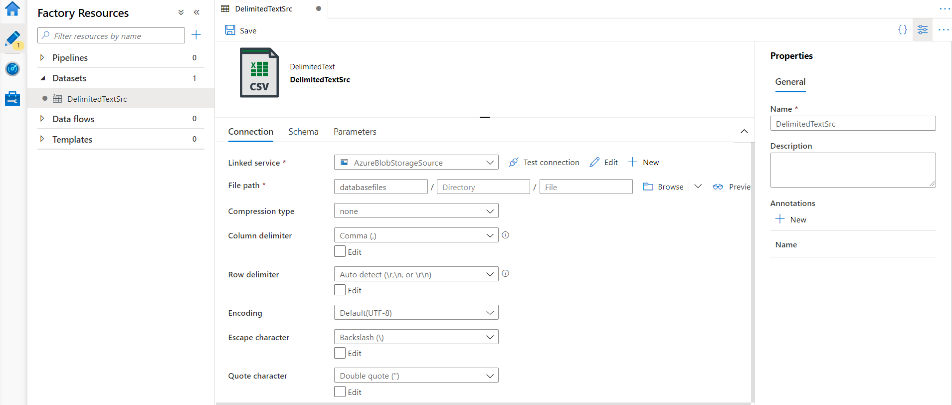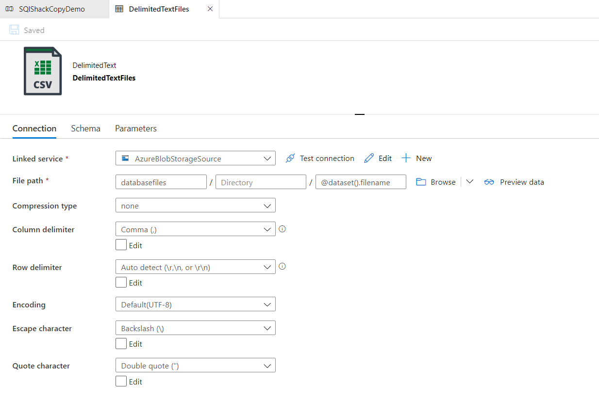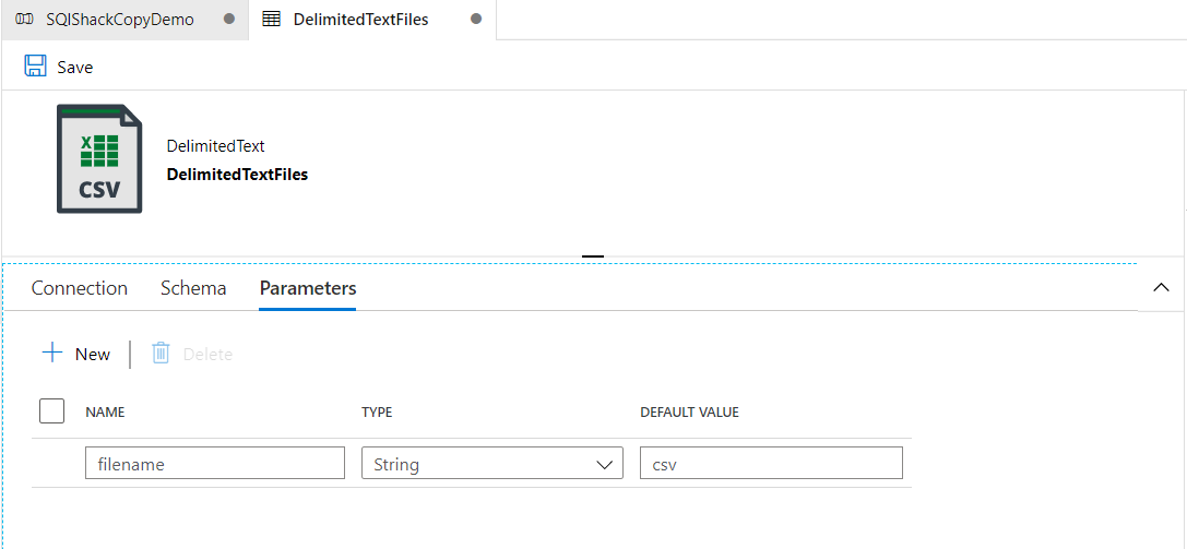 Under the Dataset settings, we will create a new Azure Blob Storage dataset with DelimitedText format and add “Filename” as a parameter for that dataset with “CSV” as a default value, as shown below: