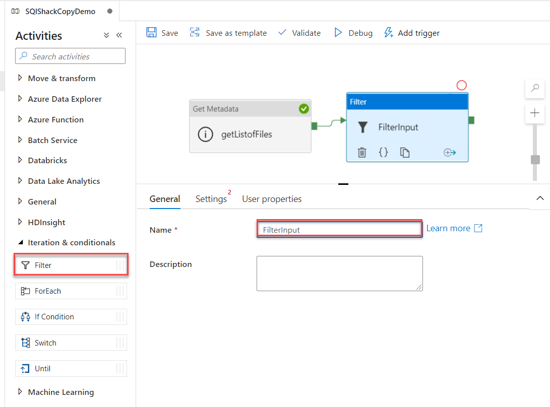 The Filter activity can be found under the Iterations and Conditions activity list then dragged and dropped to the pipeline designer surface. After adding the Filter activity, drag the output of the Get Metadata activity to be the input of the Filter activity, then provide a meaningful name for the Filter activity, as shown below: