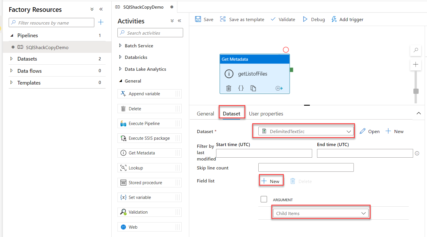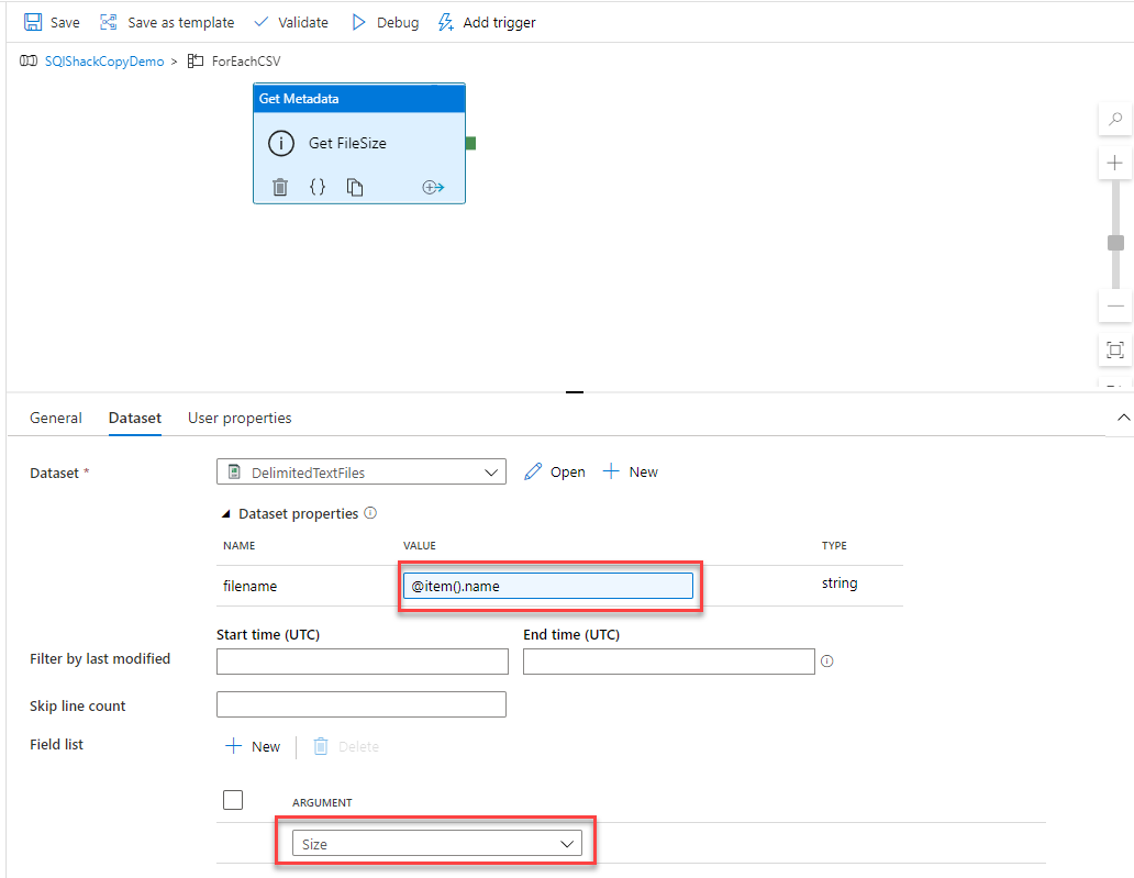 Once the Dataset is created, go back to the Dataset settings of the Get Metadata activity and set the filename parameter value as @item().name to parse the name of the files that are returned from the dataset, then from the Field List, add a new argument and select the Size as an argument, to return the size of the files that are pointed by the source dataset, as shown below: