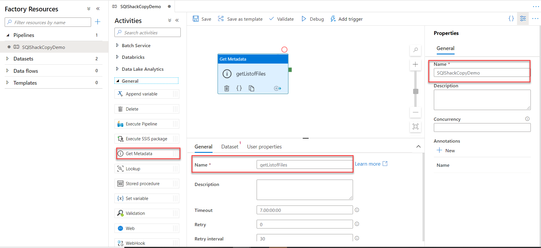 In the General tab of the Get Metadata activity, provide a meaningful name of the activity that reflects the purpose of that activity, as shown below: