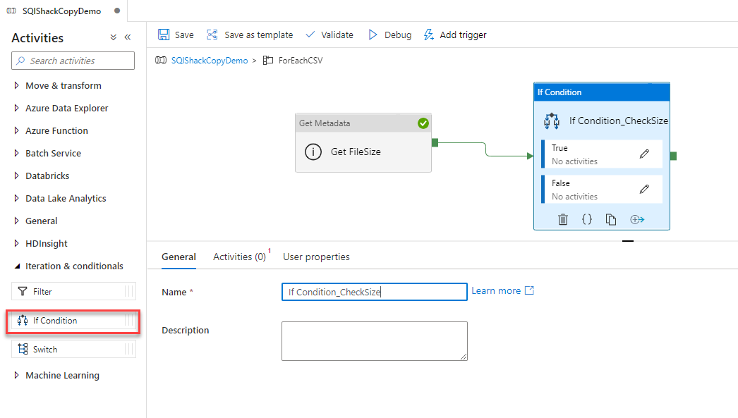 The best activity that will help in that scenario is the If Condition activity under the Iterations and Conditional activities list that will take the input of the Get Metadata activity and check the returned size. After dragging the If Condition activity and drop it inside the ForEach activity then drag the output arrow of the Get Metadata activity and use it as an input for the If Condition, provide a meaningful name for the If Condition activity, as below: