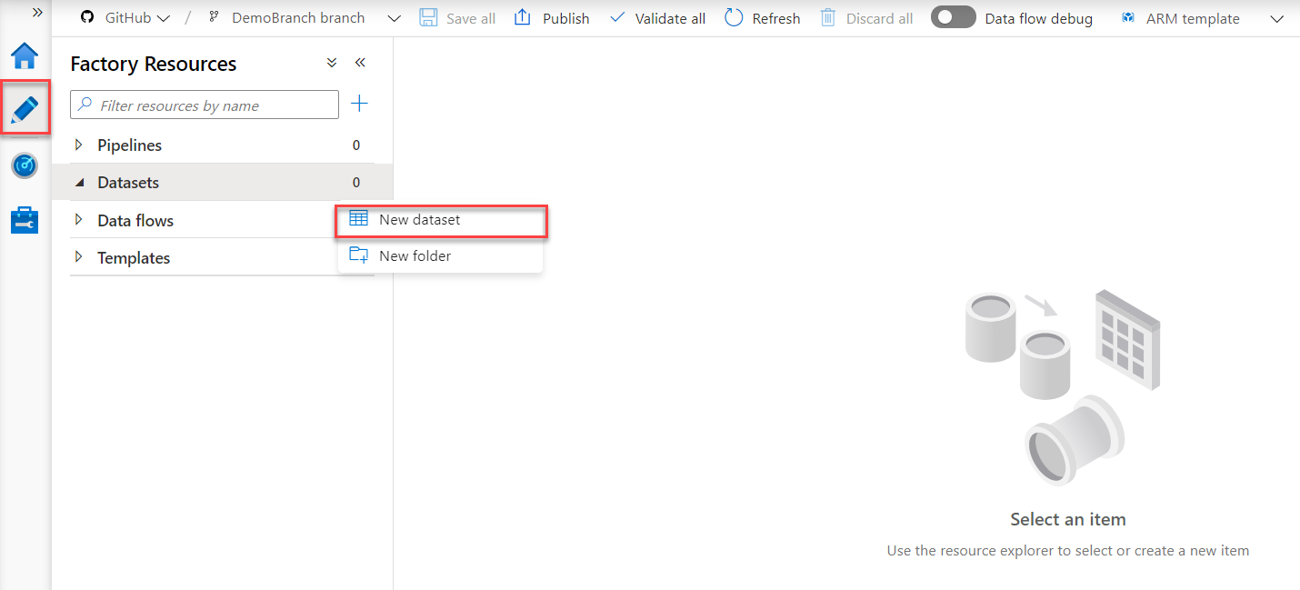 To create a new dataset, click on the Author button, choose Datasets under the Factory Resources list, choose to create a New dataset, as shown below: