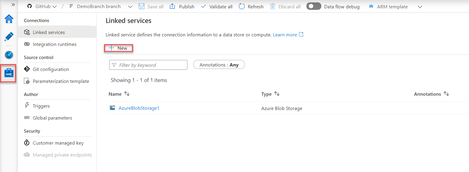 Now, we need to create the linked service that points to the Azure Blob Storage container where the CSV files are stored. To create the linked service, click on the Linked Services option under the Connections list, then click on the New button, as below: