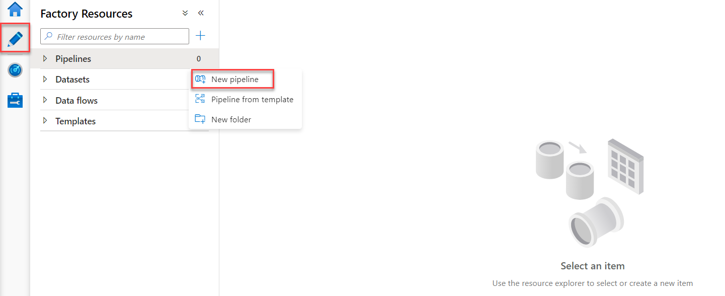To create a new pipeline, click on the New pipeline option under the Factory Resources of the Author page, as shown below: