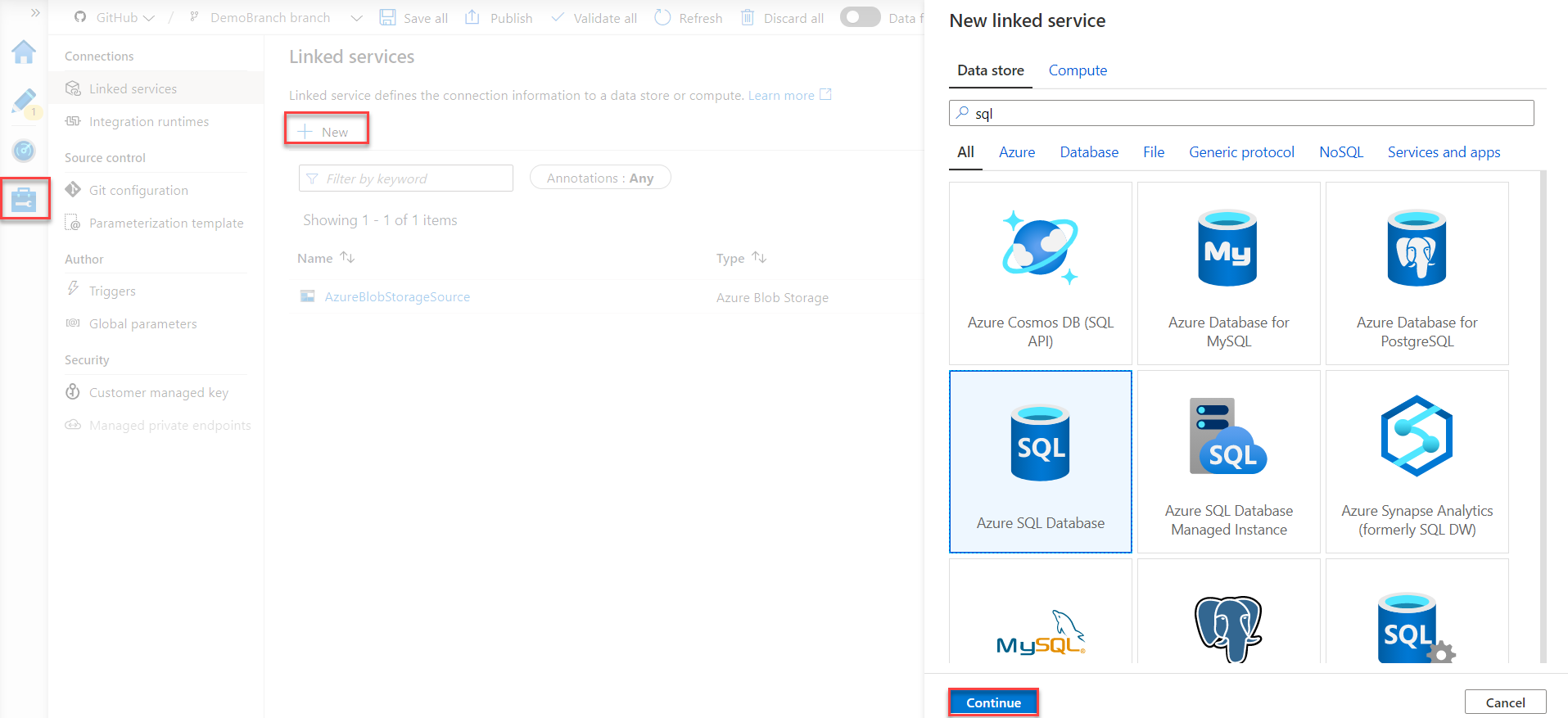 We will follow the same steps, but this time, from the New Linked Service data stores, we will choose the Azure SQL Database store then click Continue to proceed:
