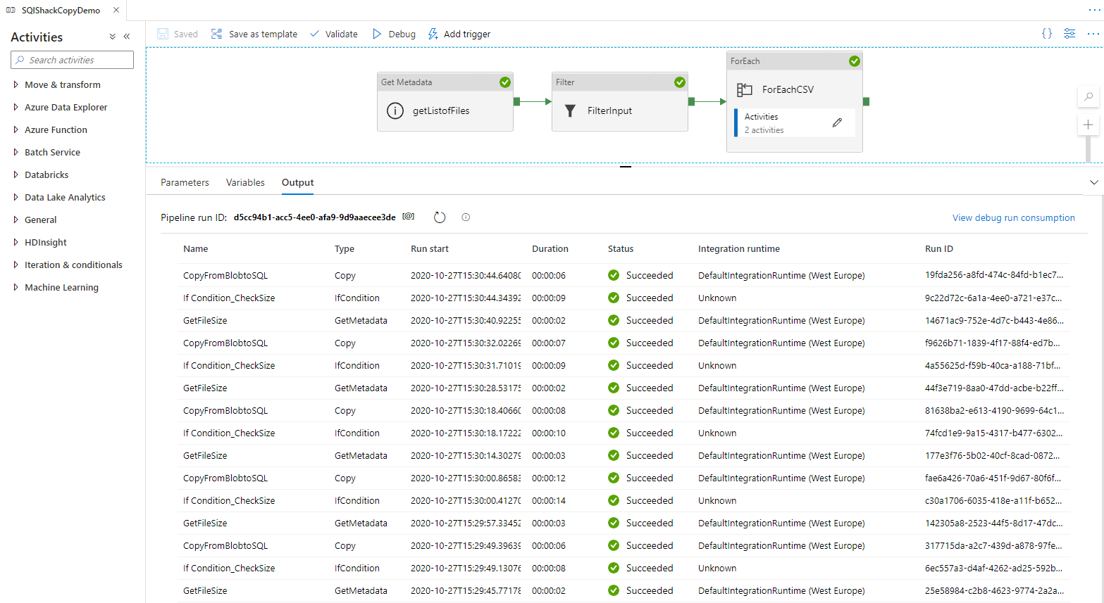 Now, the Azure Data Factory pipeline is ready with all loops and conditions. Let us execute it under debug mode, using the Debug button, to confirm that it is working as expected and you can later create a trigger to schedule it.