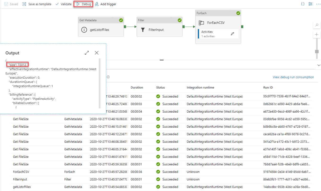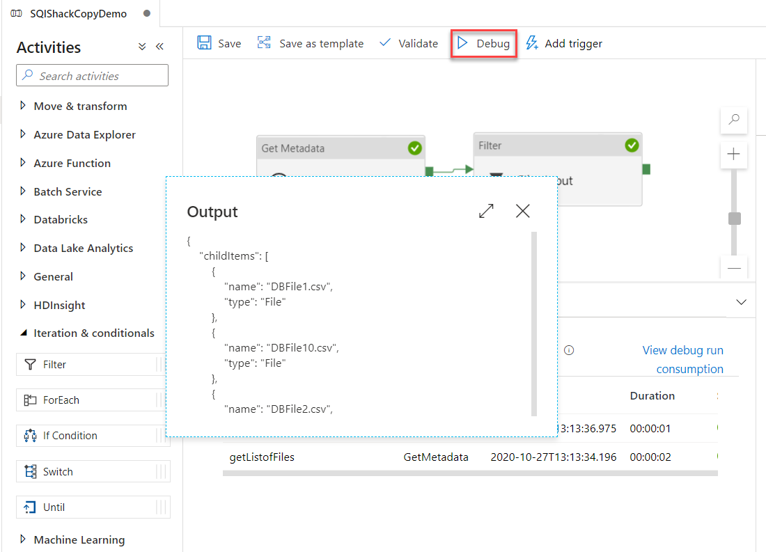 Let us test the Azure Data Factory pipeline until that point. Click on the Debug button to execute the pipeline under debug mode and confirm that both activities are executed successfully, and that the output of the Filter activity is the files with CSV extension, as shown below: