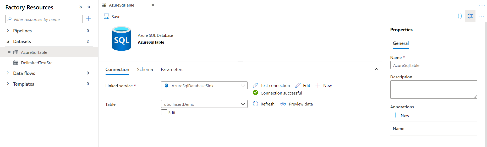 With the sink linked service created successfully, we will create the dataset that points to the database table where the data will be written in the Azure Data Factory pipeline.