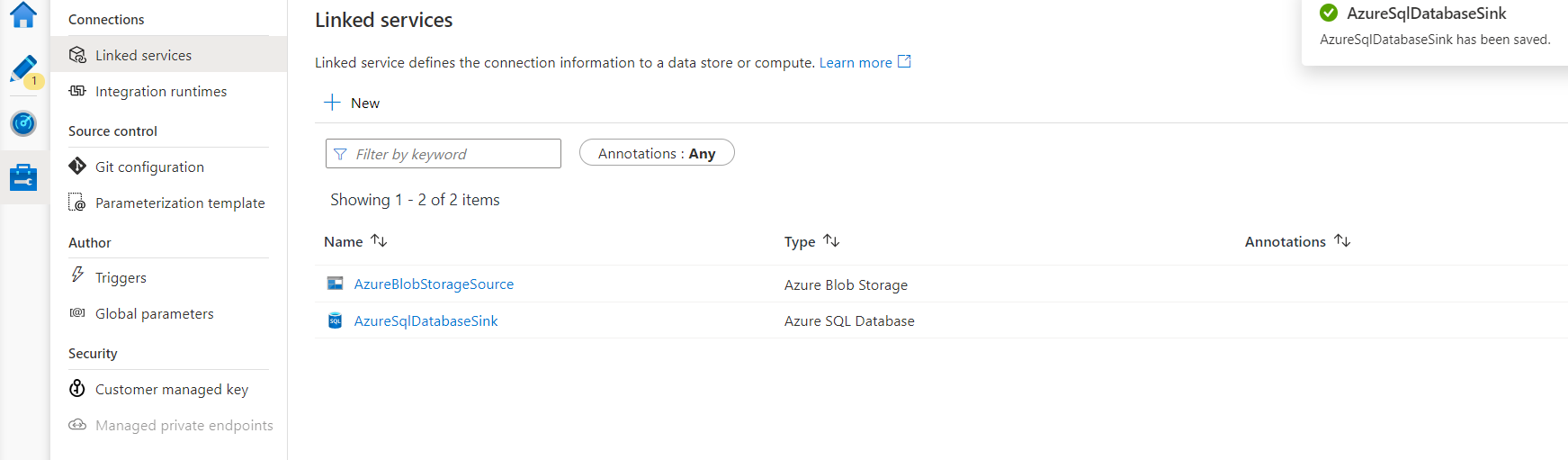 And the created Azure SQL Database linked service that will act as the data sink in our pipeline will be shown in the linked services list, as below: