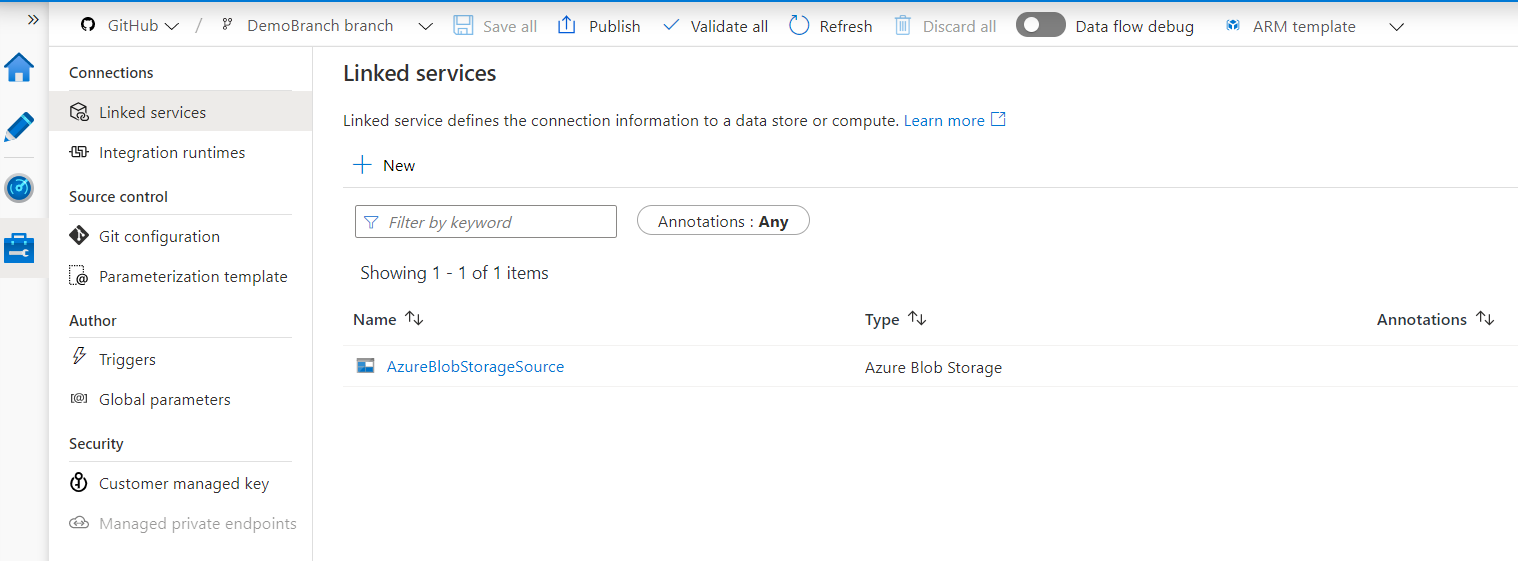 And the created Azure Blob Storage linked service that will act as the data source in our pipeline will be shown in the linked services list, as below: