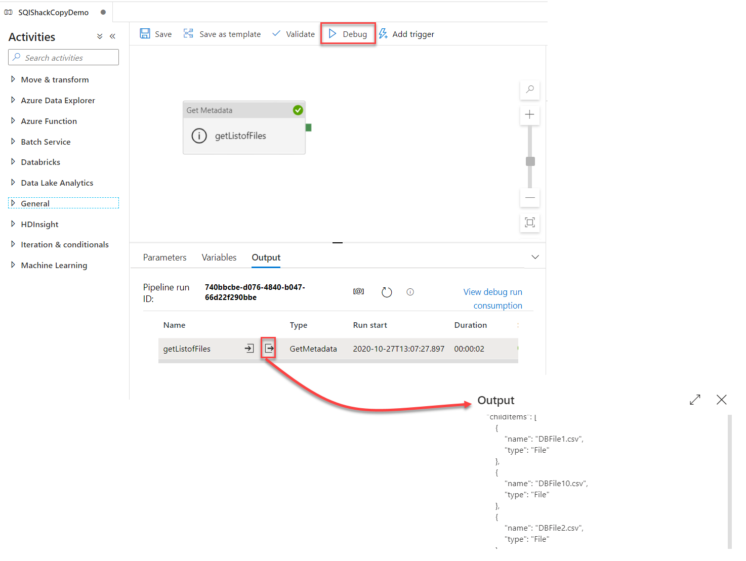 To test that activity, click on the Debug option, to execute that activity within the Azure Data Factory pipeline in the debug mode, then click to check the output of the activity execution, where it will return the list of files located in the source container and the names of these files, as shown below: