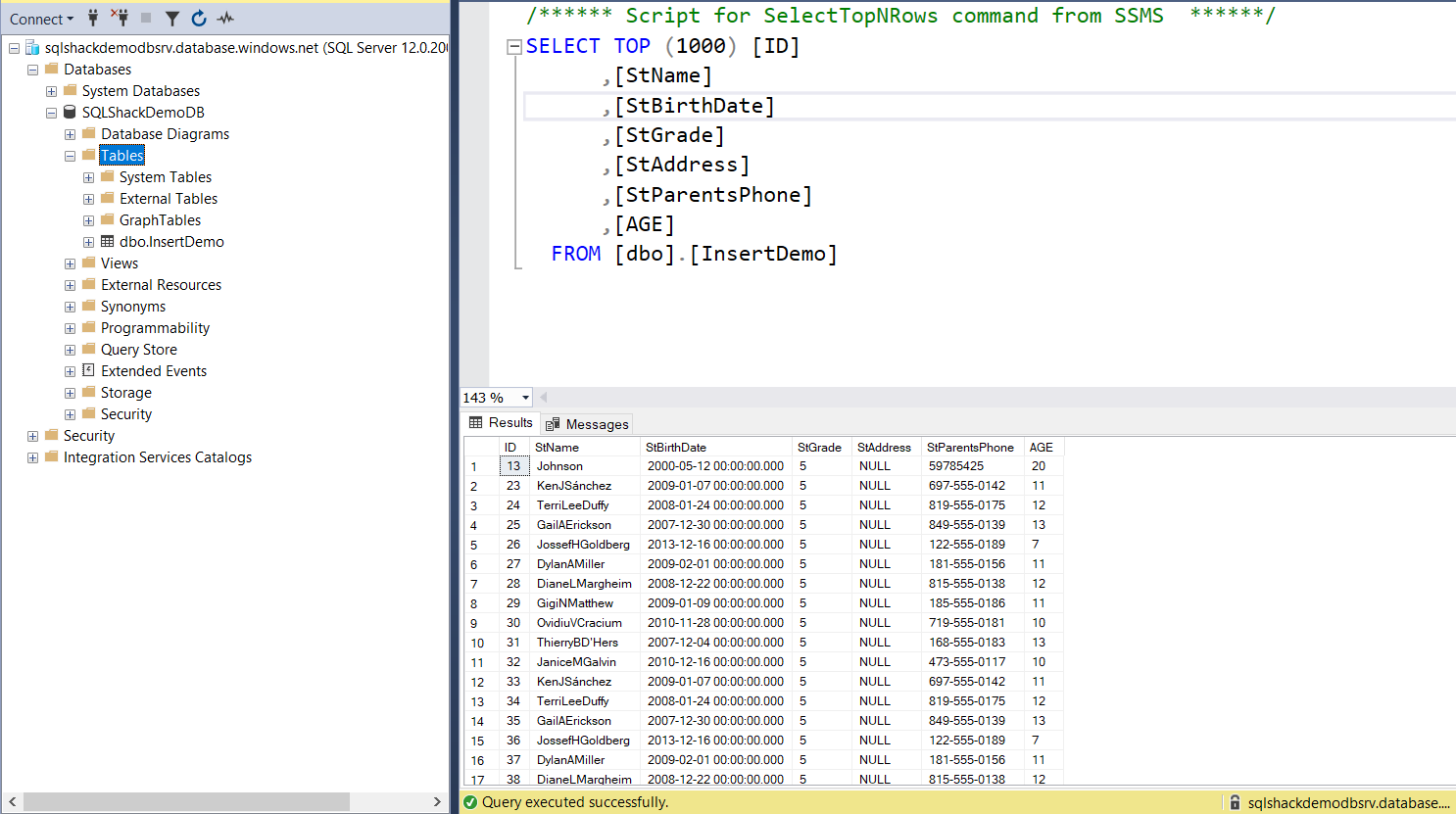 Also, we can confirm that the data is copied successfully to the Azure SQL Database by connecting to the database using SSMS, and querying the data, as shown below:
