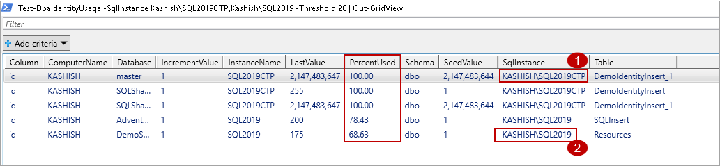 >Test-DbaIdentityUsage -SqlInstance Kashish\SQL2019CTP,Kashish\SQL2019 -Threshold 20 | Out-GridView |