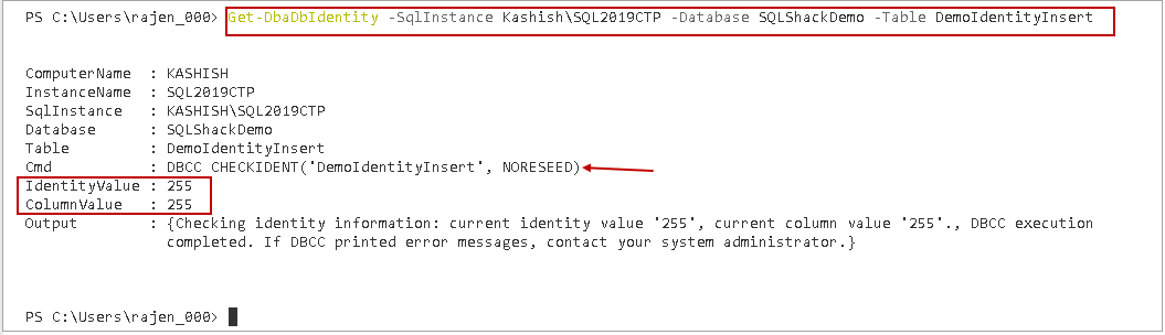 >Get-DbaDbIdentity -SqlInstance Kashish\SQL2019CTP -Database SQLShackDemo -Table DemoIdentityInsert |